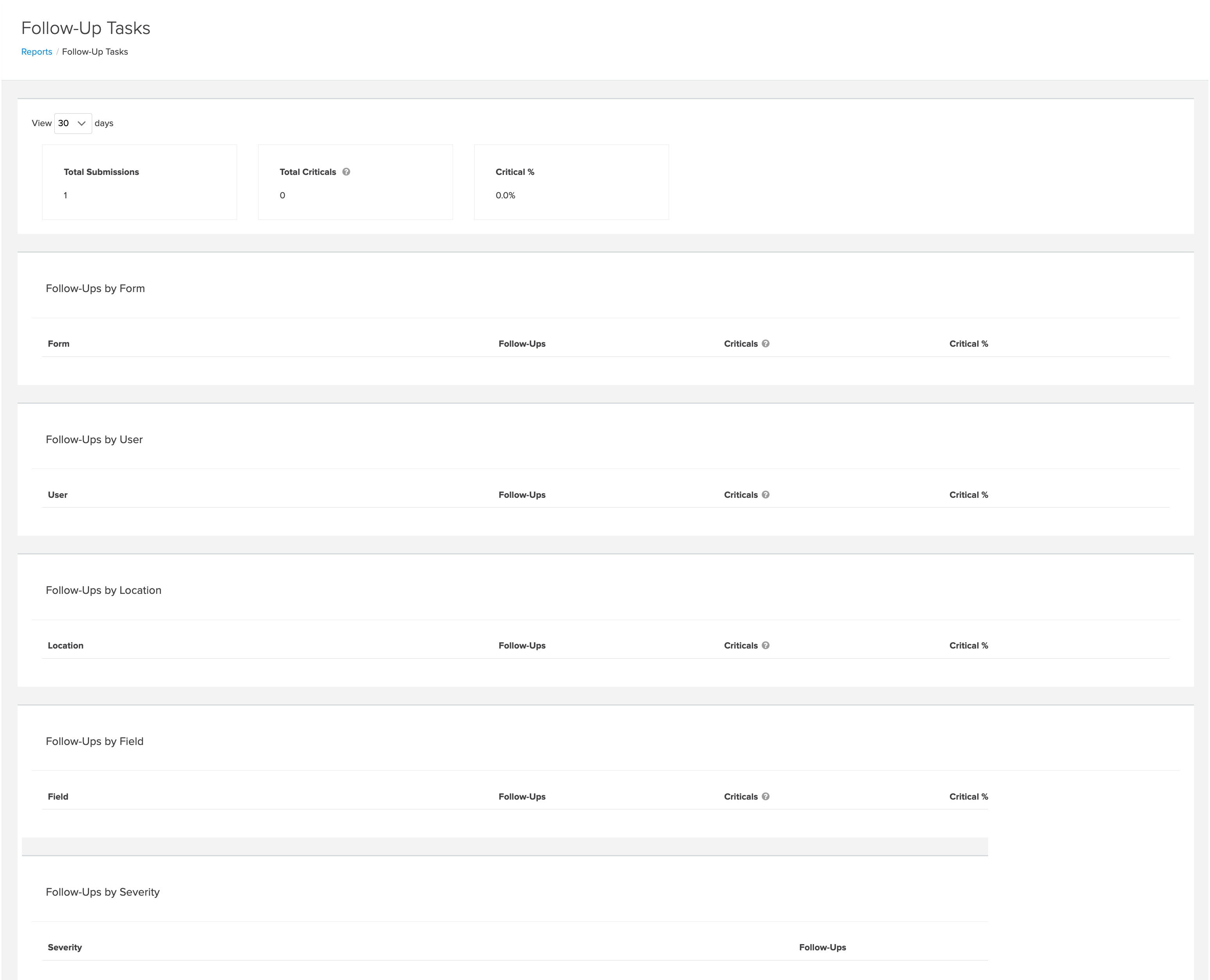 There are several aspects of this page that remain from the previous iteration of Follow-Ups. Please disregard anything labelled "Criticals," "Critical %," "Location," or "Severity." The Report Views for "Location" and "Severity" are excluded below because of their irrelevance.