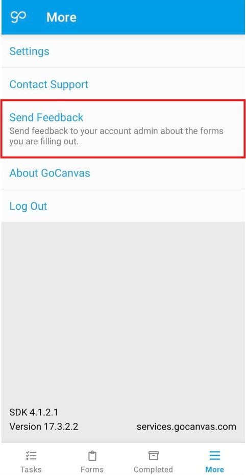 This article will detail the difference between the Feedback and Contact Support features. Each one has a specific use depending on the situation. The Feedback feature enables users to provide Feedback to their admin, while the Contact Support feature allows users to contact GoCanvas Technical Support directly from their device. Knowing the difference and using them properly can save time when getting assistance.