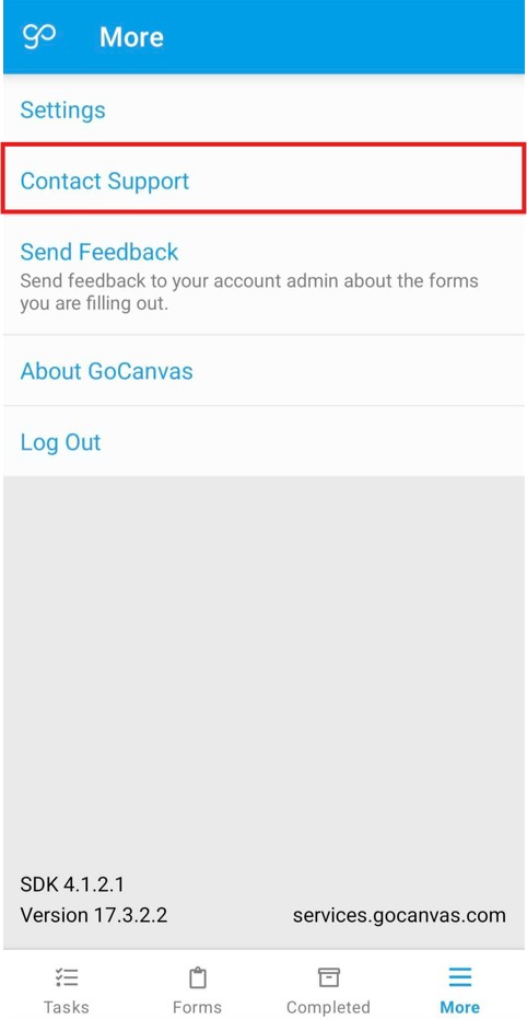 Contact Support is used for problems or questions about the GoCanvas application itself (for example, technical issues, troubleshooting, or bugs). Please use the Contact Support option found in your GoCanvas app settings. The Support button routes your request directly to the GoCanvas Support team.
