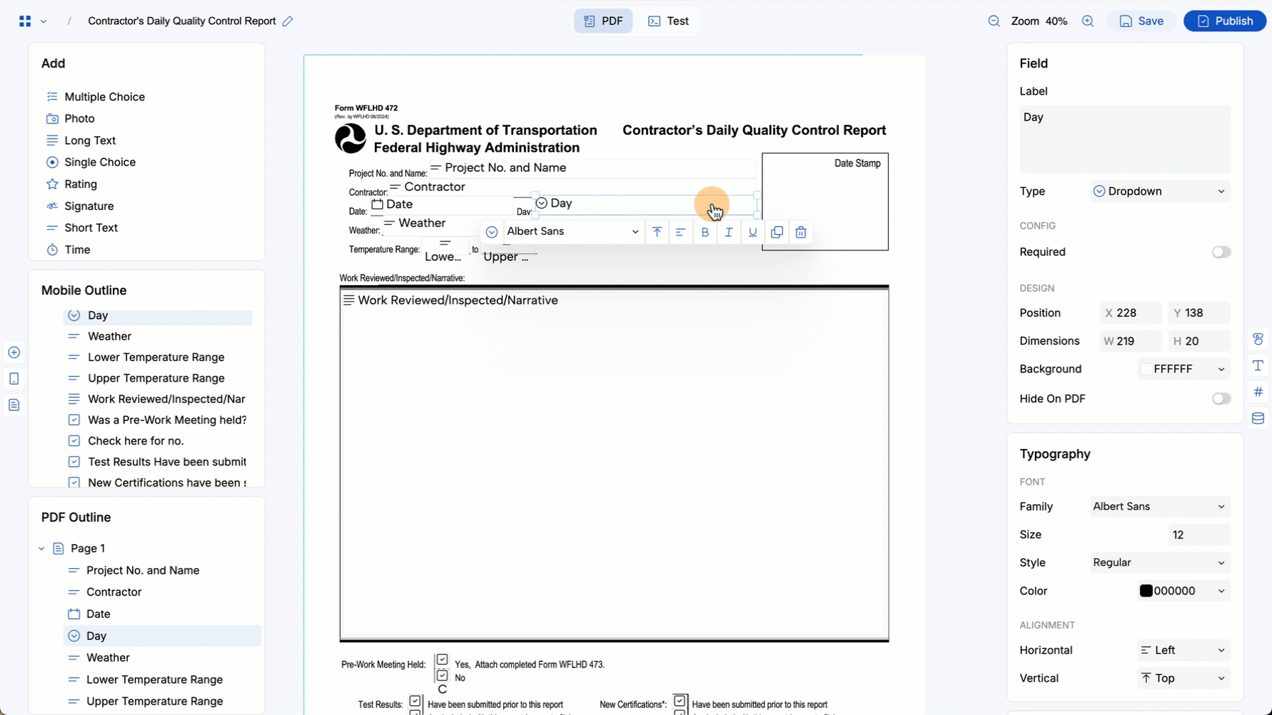 Testing will reveal any fields that may be out of order or improperly labelled. Toggle back to the PDF and in the left side of the workspace, use the Mobile Outline to reorder and relabel fields.