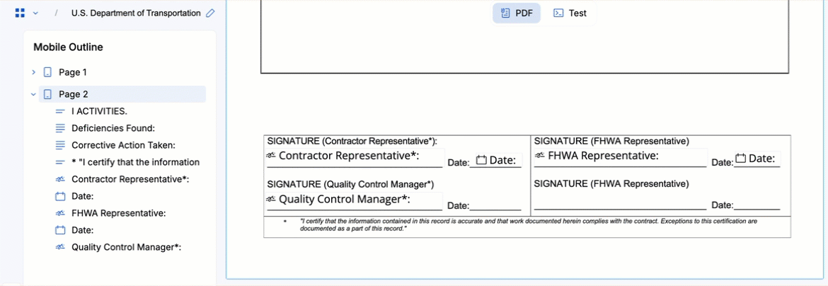 - On the left side of the workspace, in the Mobile Outline, reorder any copied fields that are not in the correct order for completing a submission.