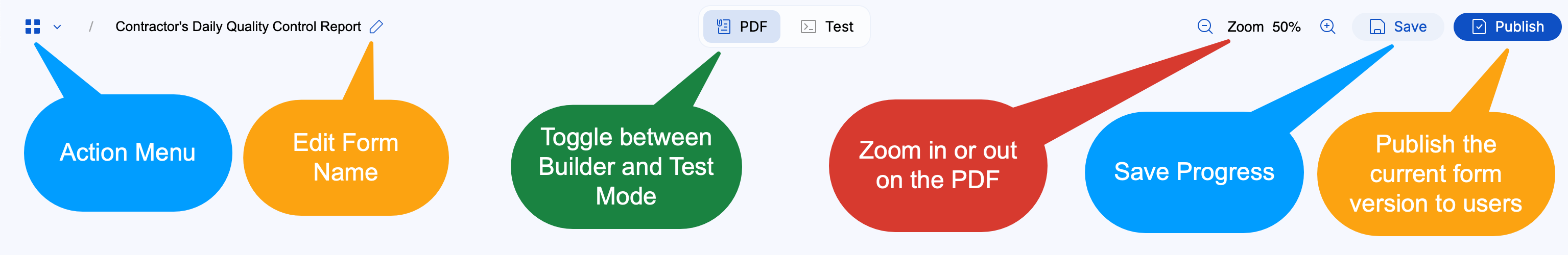 Running along the top of the Builder is a toolbar that includes several fundamental form actions.