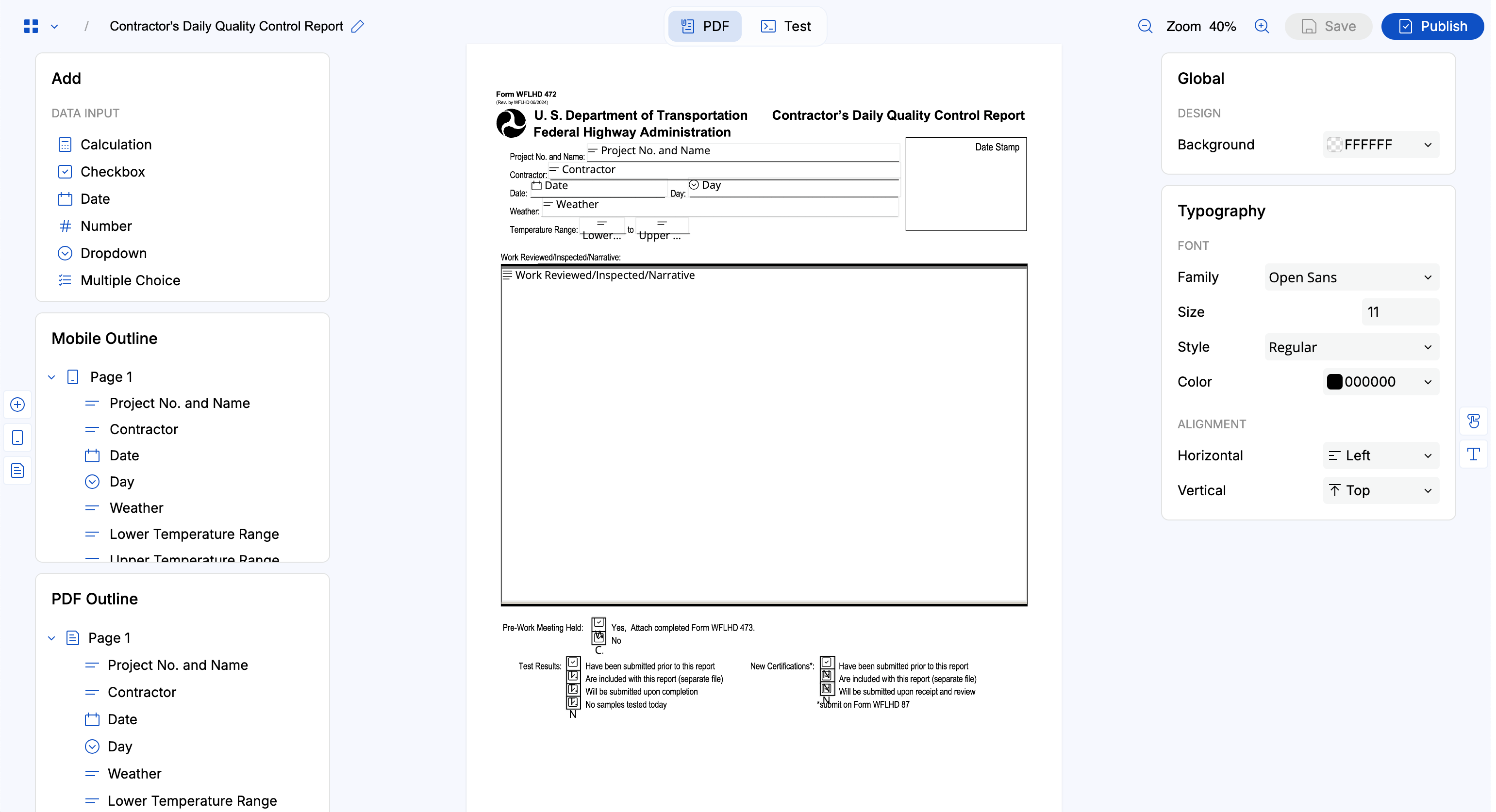 On the left side is the Add menu (aka the "Field Library"), Mobile Outline, and PDF Outline.