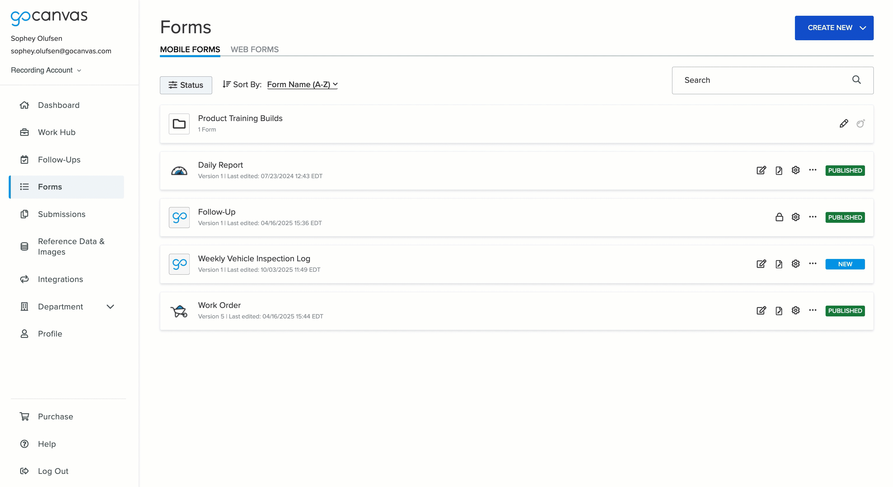 - In the upper right corner of the page, expand the Create New dropdown and select Basic Form.