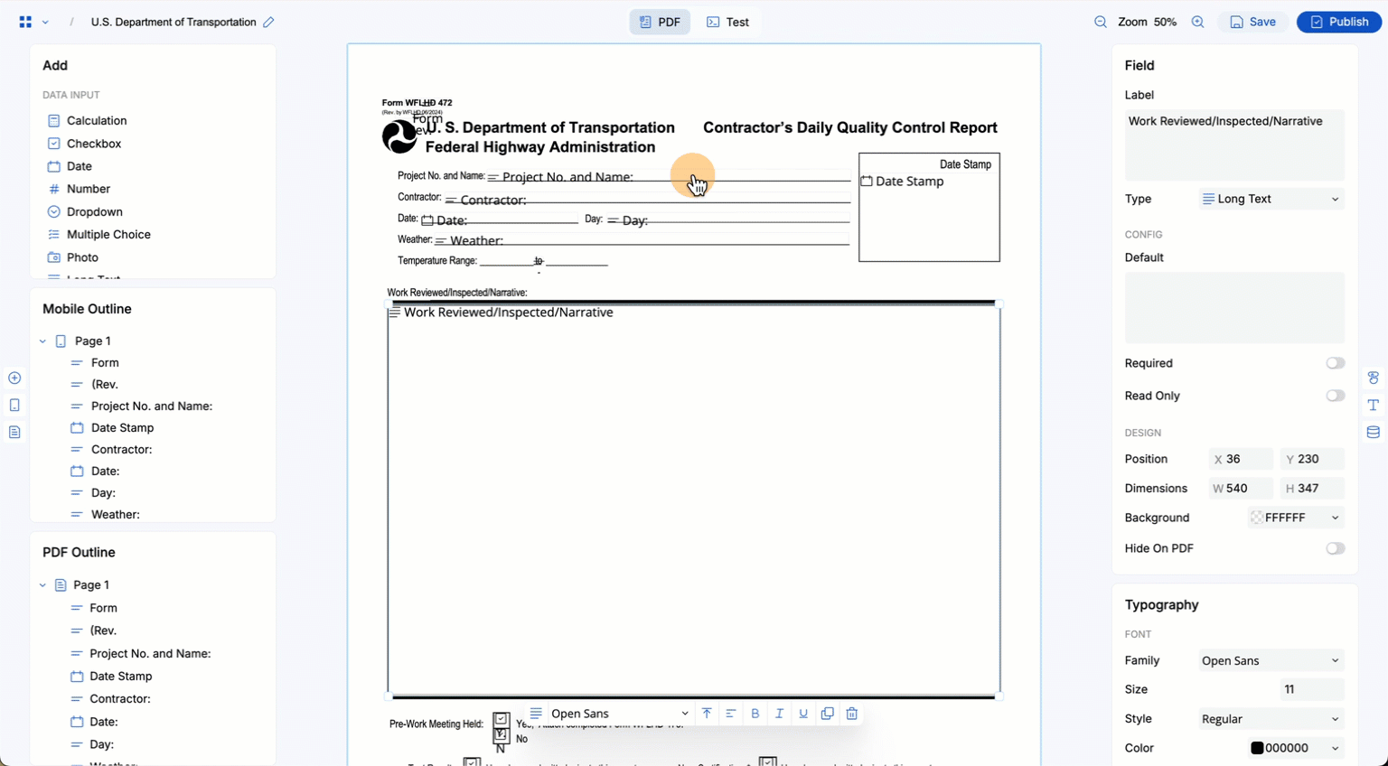 Before the form is complete, be sure to Save and toggle to the Test in browser functionality at the top of the Builder to experience the mobile form and final PDF output.