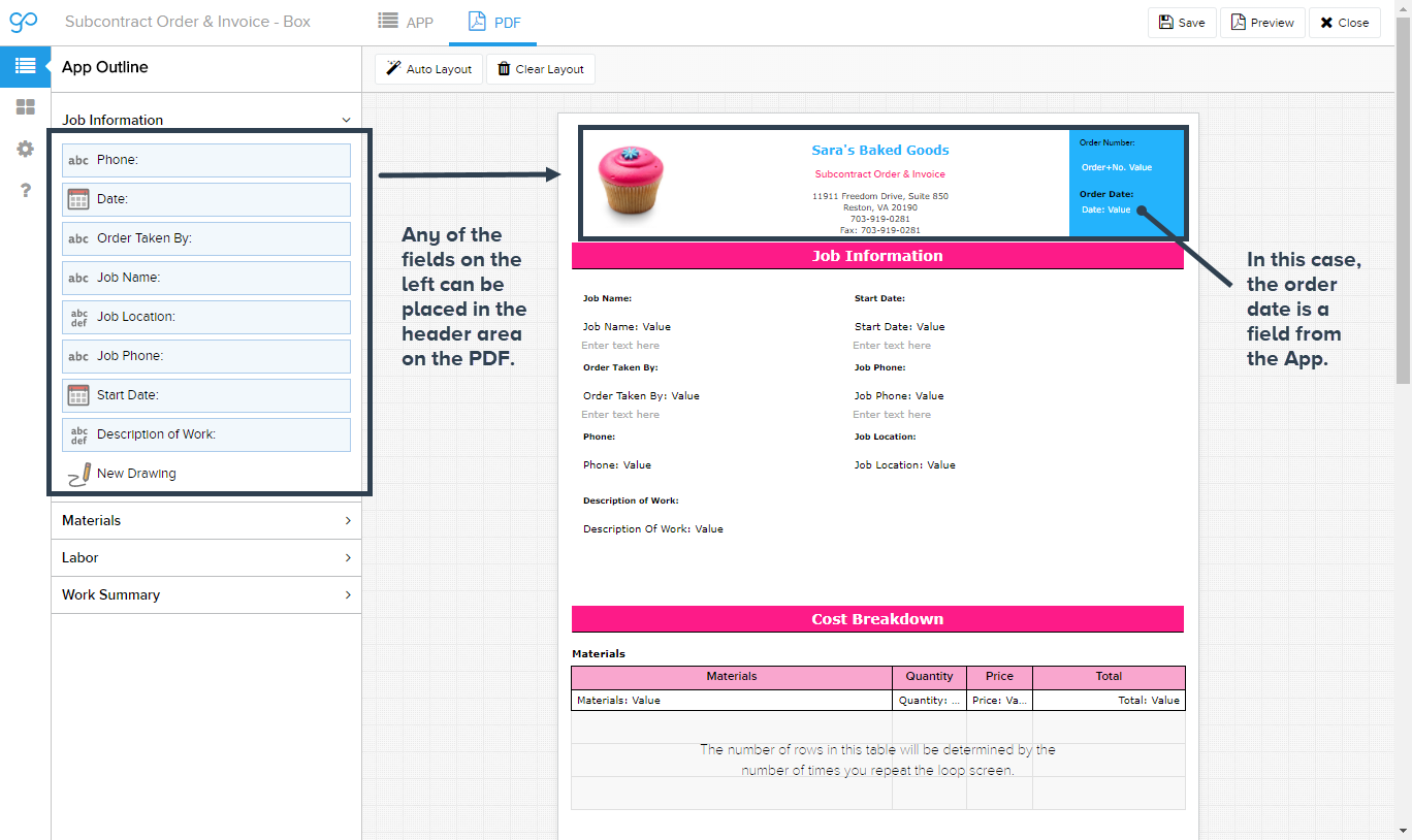 The header for both the Standard PDF and the Designer PDF can be edited and will repeat on every page. To learn more, visit the Help Center article, "Adding Content to the Standard PDF Header" or "Why does the header appear on every page in the PDF?" The footer in the PDF Designer can also be edited and repeated on every page but the Footer for the Standard PDF cannot be edited.