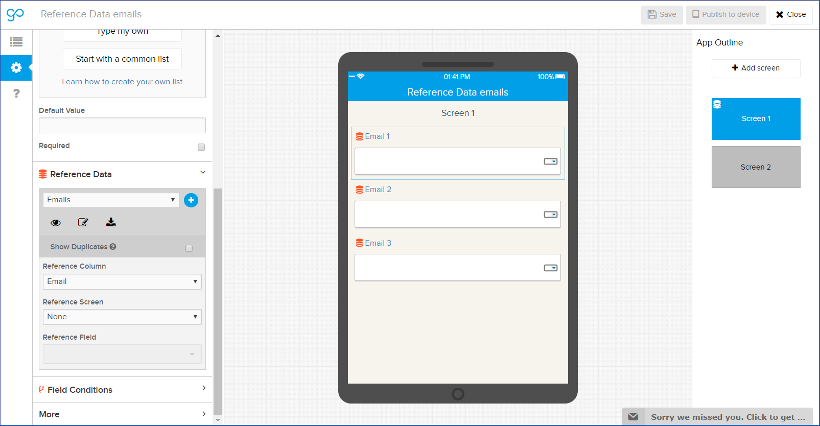 There's a work-around for this if you have an idea of how many emails people may want to enter. What you can do is have a dropdown field tied to your reference data with all of your email addresses: