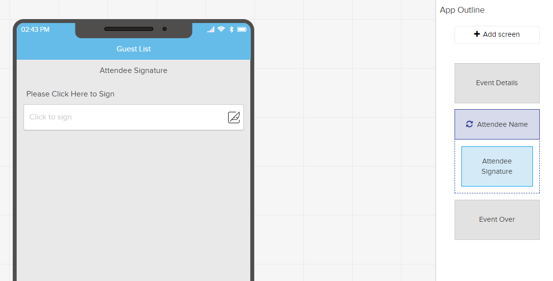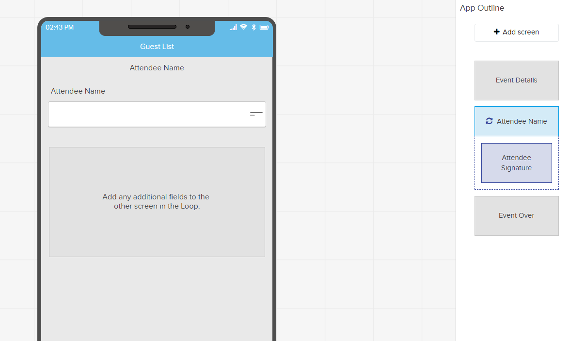 The second screen is a Loop, where the attendee will be able to add a new line item by inputting their name. On the next screen in the Loop, they can input a signature, then hit 'Done' to return to the key field (Attendee Name), where another guest can add their name.