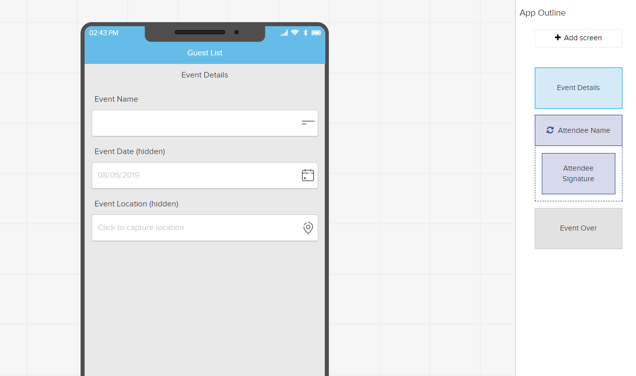 In this example App, I have set up the first screen (Event Details) for the user to input the Event Name, while the GPS and Date are automatically captured in Hidden fields.