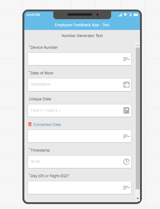 Using the example you provided to my colleague in Support, let's say you want to generate a string of integers based on an equipment number, the date, and if day or night shift completed the submission.