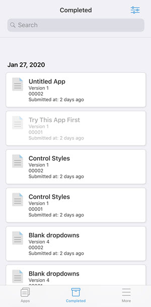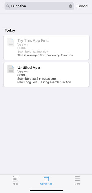 You can search for specific data input across Submissions using the Search box at the top of the Completed screen. Note: the search results will also be based on the Filter settings, so make sure they are set as desired.
