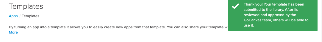 Once you have clicked Share, a confirmation message will pop up in the upper right corner, letting you know that the App Template is under review. Once it is accepted, it will be posted to the Application Store for other users to download: