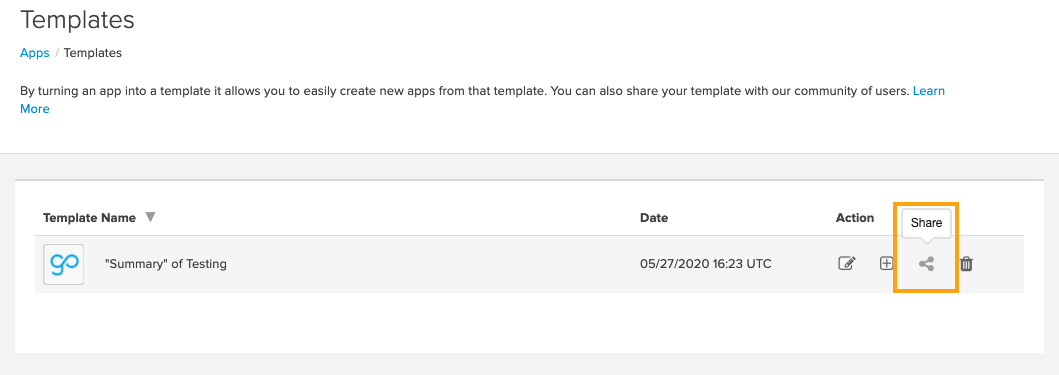 Once you have created a template of your App, you can navigate to the Templates page, and choose Share from the quick actions on the right side of the Template Name: