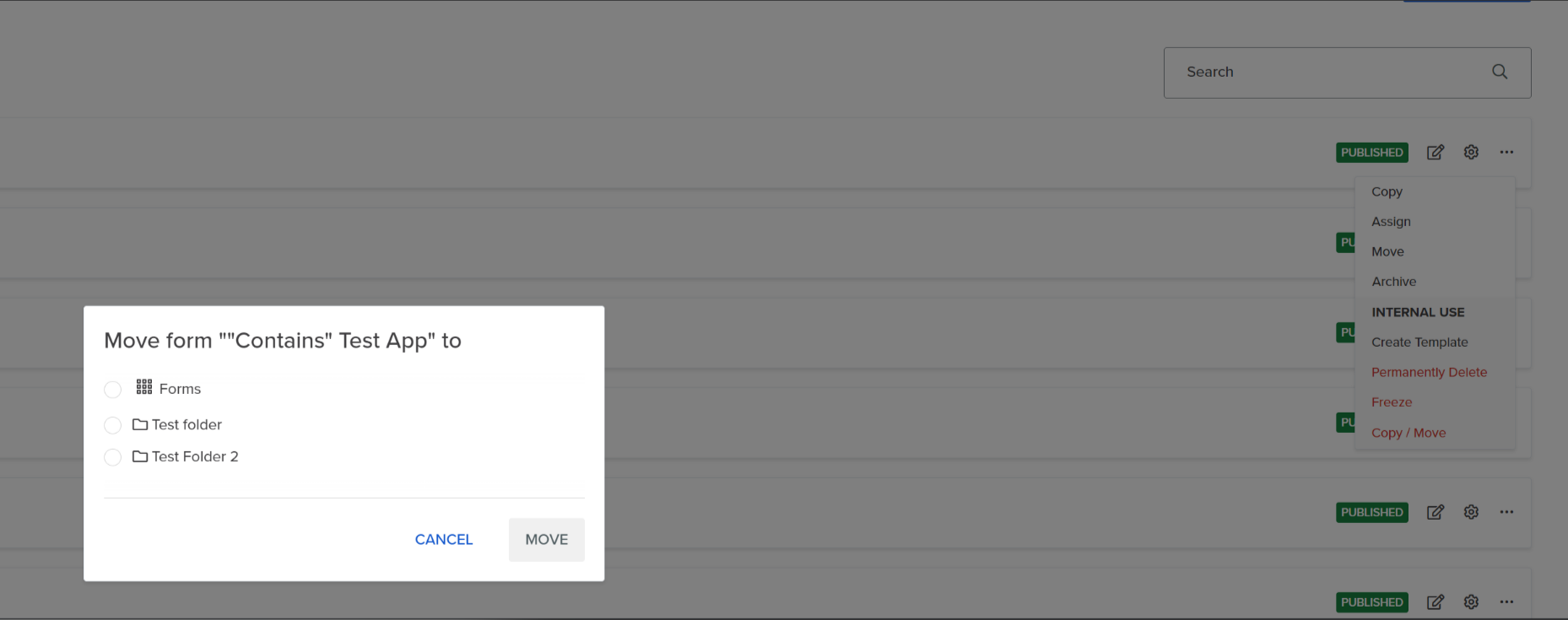 3.Yes, it is possible to move forms from one folder to another. Once in the folder, click on the three dots to the right of the form, select move, and you will be prompted choose a new location.
